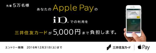 先着5万名様限定です! 三井住友カードを利用している方には朗報! iPhoneのApple Payに三井住友カードを登録して、iPhone7またはApple Watch 2をかざして支払い(iD払い)をすると5,000円まで負担してくれるという神キャンペーンです。登録はこちらから 先着5…
